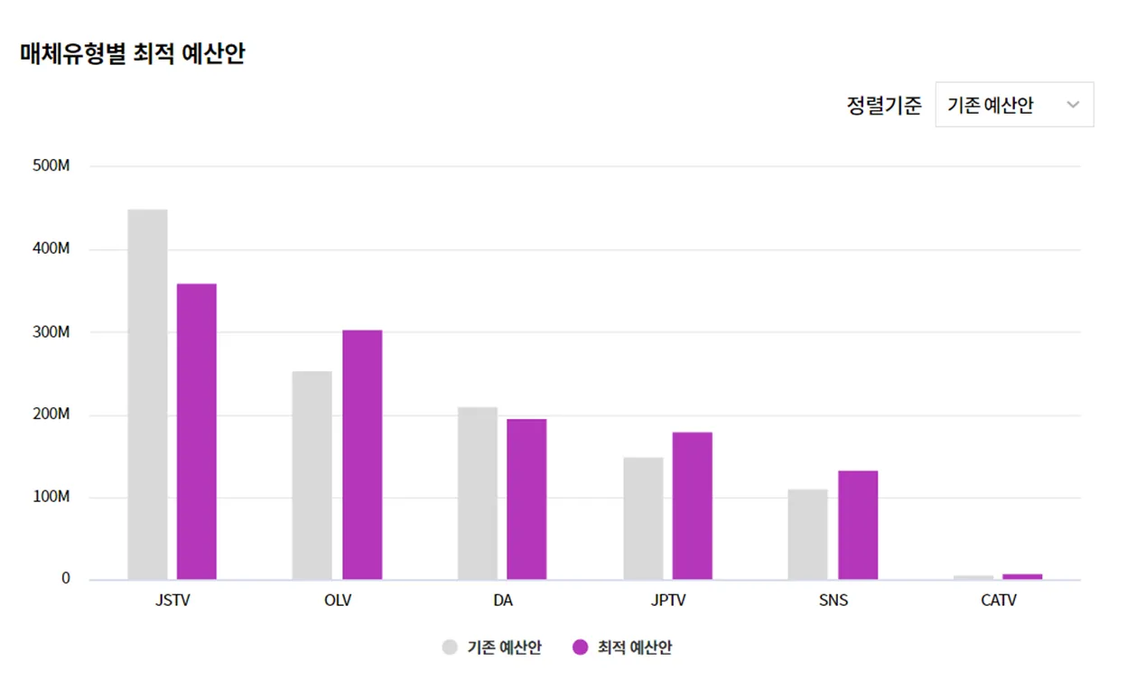 분석한 결과를 토대로 더 높은 kpi를 달성하기 위한 최적 예산안을 도출해보세요 해당 예산안 집행시 얼마만큼의 kpi 상승률을 보이는지도 예측할 수 있습니다 해당 kpi 모델이 학습 완료 학습 완료 한 경우에만 최적 예산 배분이 가능합니다 1\ 같은 예산으로 같은 예산으로 최대 kpi 달성하는 최적 예산안 산출하기 같은 예산 금액으로 최대 kpi를 달성할 수 있는 최적 예산 배분안을 확인할 수 있습니다 이는 kpi 별로 선택하여 특정 kpi에 맞는 최적 예산안을 확인할 수 있습니다 만일 분석에 활용된 kpi 중 '페이지 방문'이 가장 중요했다면 해당 kpi를 선택하여 최적 예산안을 확인 후 추후 마케팅 믹스 기획에 참고할 수 있습니다 결과 확인 해당 kpi를 최대 달성할 수 있는 최적 예산안과 기존 예산안을 비교한 차트입니다 특정 kpi 별로 어떤 매체가 kpi 달성에 유리한지, 기존과 대비해서 얼만큼의 예산을 어떤 매체에 이동해야하는지를 확인할 수 있습니다 기존 예산안의 kpi 예측값과 최적 예산안 집행시 달성 가능한 kpi 예측값을 비교한 차트입니다 기존 예산안 kpi 수치는 실제 kpi 수치가 아닌 모델 내에서 예측한 kpi 수치입니다 이때 해석에 주의해야할 점은 기존 예산안의 kpi 수치 또한 예측값이라는 점 기존 예산안의 kpi 수치 또한 예측값이라는 점 입니다 kpi 상승률을 동등한 조건에서 비교하기 위해서 기존 예산안 또한 kpi 값을 예측하여 분석합니다 2\ 새로운 예산 금액, 조건으로 새로운 예산 금액, 조건으로 최적 예산안 산출하기 학습된 분석 모델을 토대로 새로운 예산 금액으로 최대 kpi 달성을 위한 광고 전략 예산안을 산출할 수 있습니다 다음 마케팅 캠페인을 위해 새로운 최적 예산안을 도출해보세요 최적 예산안을 산출하고 싶은 kpi 선택하기 새로운 예산 금액 입력하기 만일 기존 예산 금액에서 분석기준별 예산 배분만 조정하고 싶다면 '예산 배분 상세 옵션'만 설정해보세요 (분석 기준별) 예산 배분 상세 옵션 설정하기 매체별 예산 배분에 상세 조건을 걸어서 분석할 수 있습니다 예산 배분 상세 옵션을 미적용하여 재분석을 실행합니다 미적용했을 시 예산 변동 범위는 기본 변동 범위인 20%를 기준으로 최적 예산안을 탐색합니다 예산 변동 범위란 분석 기준별(ex 매체별) 예산의 변동 범위를 말합니다 예를 들어 유튜브 1억 기존 집행시 예산 금액은 0 8 1 2억 범위에서 움직일 수 있습니다 분석 기준별 예산 배분 조건 분석 기준별 예산 배분 조건 을 상세히 설정할 수 있습니다 특정 광고 전략의 예산 고정, 범위 설정이 가능합니다 만약 sns 광고는 예산 범위의 20%로 꼭 고정하고 싶다면 예산 비중 조건을 20%, 조건을 '같다'로 설정하고 재분석을 실행해보세요 예산 변동 범위 설정이란, 분석 기준별 예산 최대 변동 범위 분석 기준별 예산 최대 변동 범위 를 설정하는 기능입니다 예산 배분 상세 옵션을 '미적용'할 시 예산 변동 범위는 기본 조건인 20% 20% 로 고정됩니다 예를 들어 아래와 같은 기존 마케팅 믹스에서 예산 변동 범위가 20%로 설정되었다면 아래와 같은 변동 범위 안에서 최적 예산안을 산출하게 됩니다 매체 기존 예산 변동 범위 (20% 변동) 유튜브 1억 0 8억 1 2억 메타 2억 1 6억 2 4억 네이버 5억 4억 6억 최대 변동 범위는 99%까지 가능하나 예산 산출 목적에 따라 변동 범위 수치를 조정하시길 바랍니다 기존 예산안과 유사한 예산안 20% 30% 분석 적정 예산 변동 범위 50% 최대 설정 범위 99% 설정 완료했다면 최적 예산안의 재분석 실행 클릭 설정한 총 예산과 상세 옵션은 기존 분석 데이터에 따라 오차 범위가 발생할 수 있습니다 3\ 최적 예산 재분석 실패 위 방법으로 추가로 설정한 예산 배분 조건에 따라 분석이 실패한 경우입니다 다시 새로운 예산 금액, 조건을 설정하여 재분석하거나 이전 배분안으로 돌아갈 수 있습니다 이전 배분안으로 가기 가장 최근에 실행했던 분석 배분안으로 다시 돌아갈 수 있습니다 클릭시 예산 시나리오 리포트에도 해당 배분안이 화면에 로드됩니다 예산 배분 재분석 실행 예산 금액 및 예산 상세 옵션을 다시 재설정하여 분석합니다